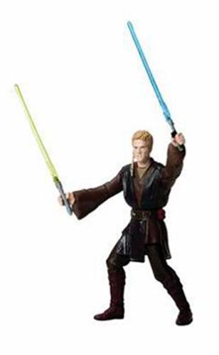 Ten years after the fight to save Naboo from invasion, the galaxy is on the brink of civil war. Under the leadership of a renegade Jedi, thousands of solar systems threaten to secede from the Galactic Republic. A courageous Jedi Knight, his impulsive apprentice, and a queen-turned-senator are drawn into the heart of the conflict... and the beginning of war. Hasbro continues the Star Wars adventure with this line of action figures for Star Wars Episode 2: Attack of the Clones. Assigned to escort Senator Amidala safely to Naboo, Anakin dresses in peasant clothes to hide his Jedi identity. Anakin Skywalker as seen in the Hanger Dual comes complete with Blue and Green Lightsabers and features Removable Arm, Force Power and Lightsaber Slashing Action. Collect them all, each sold seperately.
