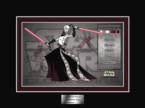 One of the most deadly and tragic opponents to emerge from the battlefields of the Clone Wars was Asajj Ventress, a disciple of the dark side and sworn enemy of the Jedi. A lifetime of enduring cruel hardships had purged any compassion from her cold heart, and a fierce survival instinct forged in the ceaseless dangers of her bloody homeworld kept her on the dark path. A Character Key is reproduced on a clear acetate cel which "floats" above the illustrated backing board.The Matte measures 6" x 8" and the artwork is approximately 4" x 6".The edition number is printed on a metal plaque affixed to the front of the Character Key and includes a certificate of authenticity from Lucasfilm.The Edition size for the Asajj Ventress Character Key is set at 1250 Pieces Produced Worldwide.